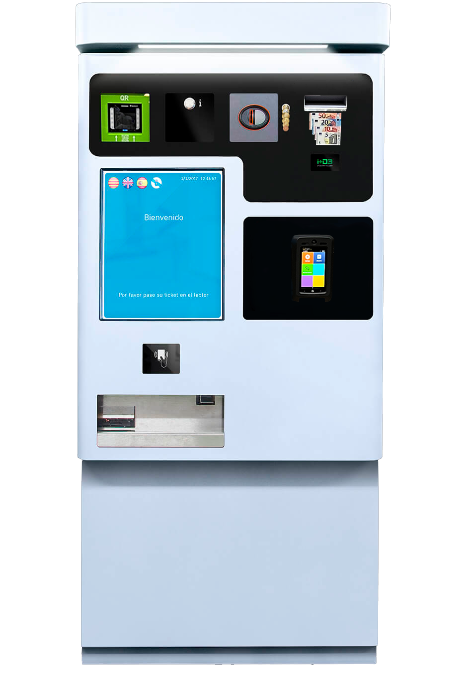 El cajero automático para parking cuenta con un lector de tickets encargado de leer los código de barras de los mismos, conectándose con el sistema local para calcular el precio de la estancia.
